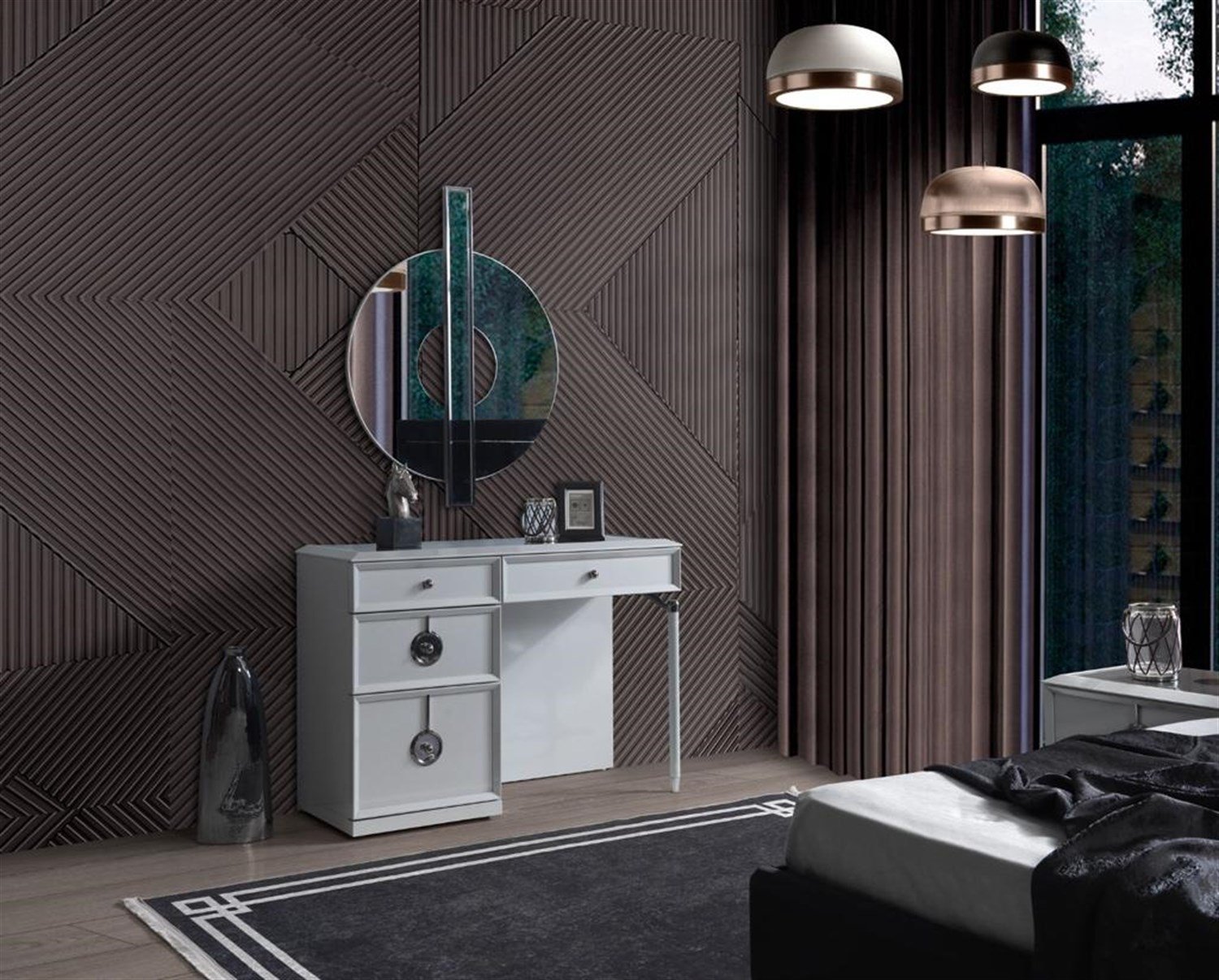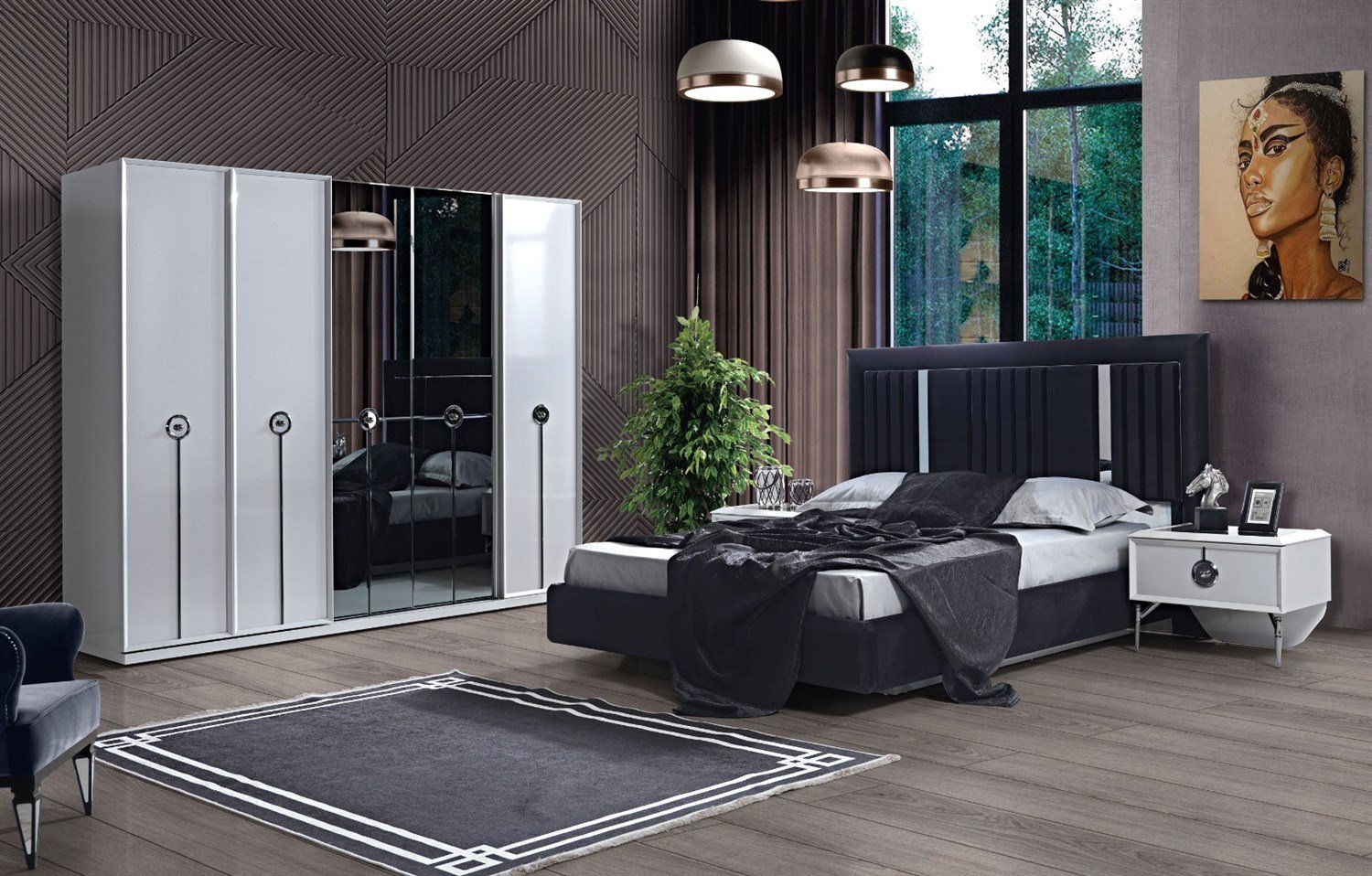 Takım İçeriği  1 Adet Karyola, 1 Adet Gardırop, 1 Adet Şifonyer + Ayna, 2 Adet Komodin.