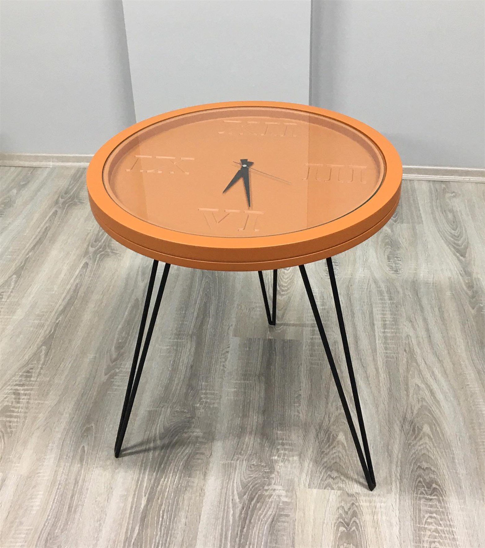 Ceviz kaplama Turuncu Boyalı Ayakları fırınlanmış boya siyah metal Saat pille çalışır Üstü camdır Temin süresi: 15 gün (elimizde varsa sipariş olduğunda hemen gönderimini yapabiliriz)